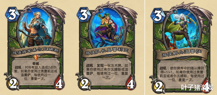 首先是“奇闻”,玩家把带有“奇闻”的橙卡放进卡组里面,系统会自动增加额外的橙卡,拿这三张游侠姐妹来说,它的作用有三个:解场、加BUFF和发现,而且每个职业都拥有一张奇闻橙卡,具体的效果都不大一样。