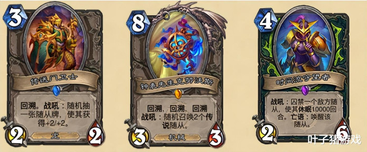 类似“回溯”效果的卡牌还有“传送门卫士”3费2/2和“钟表先生克劳沃斯”8费3/3,别看只有3/3的身板,这张卡最厉害的地方在于可以使用三次回溯,也就是说有四次机会召唤2个传说随从,直到你满意为止。