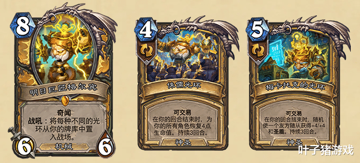 接下来是“明日巨匠格尔宾”这张奇闻,8费6/6的身板,将每种不同的光环从牌库中置入战场,最关键的是两张新卡“侏儒光环”和“梅卡托克的光环”都是可以交易,要不然抽到手里就完了,毕竟费也不少。