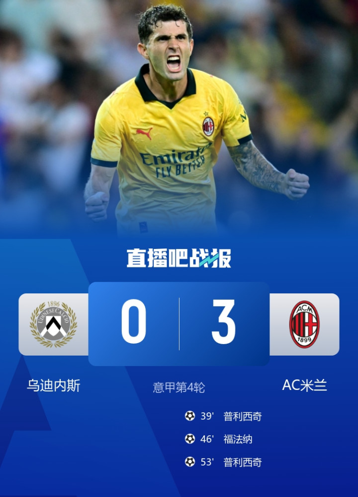 普利西奇2射1传,乌迪内斯0-3米兰。积分榜方面乌迪内斯7分第五,米兰9分暂第三。