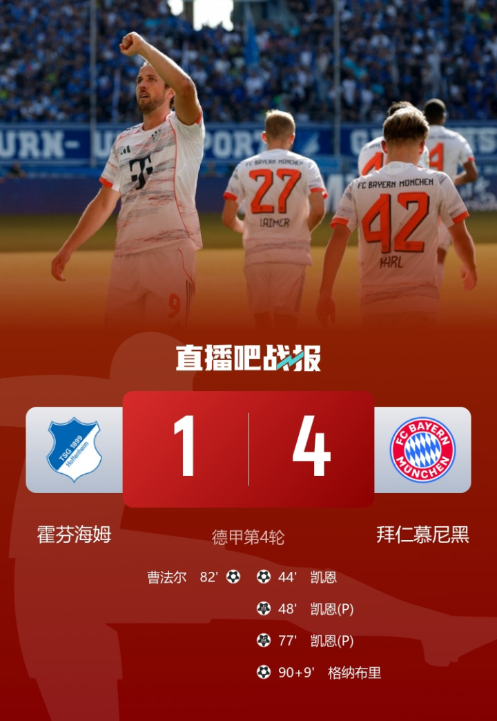凯恩戴帽,拜仁4-1霍芬海姆,开赛四连胜继续领跑积分榜。