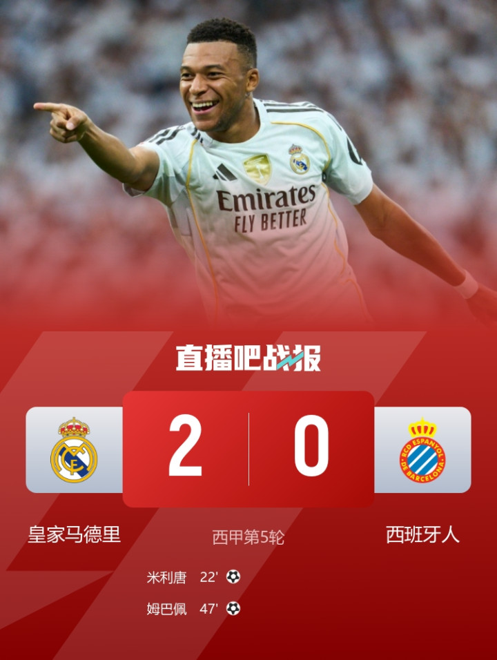 姆巴佩世界波破门,皇马2-0击败西班牙人,取得联赛5连胜,继续领跑西甲。