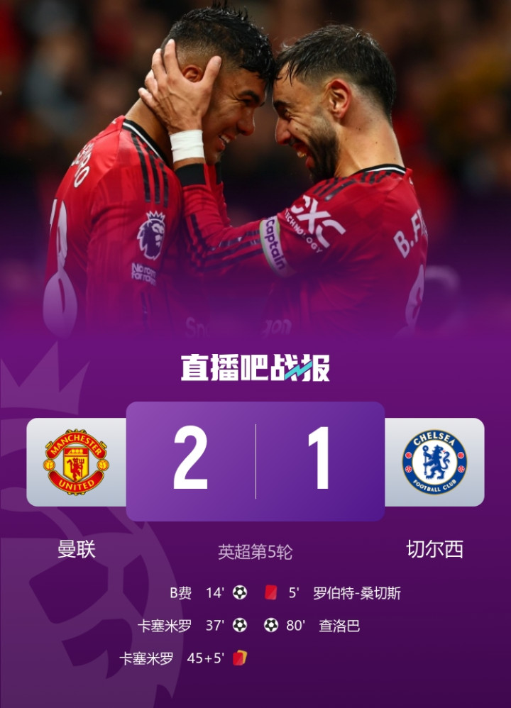 桑切斯5分钟直红,B费破门,卡塞米罗扩大比分+染红,最终十人曼联主场2-1战胜十人切尔西。