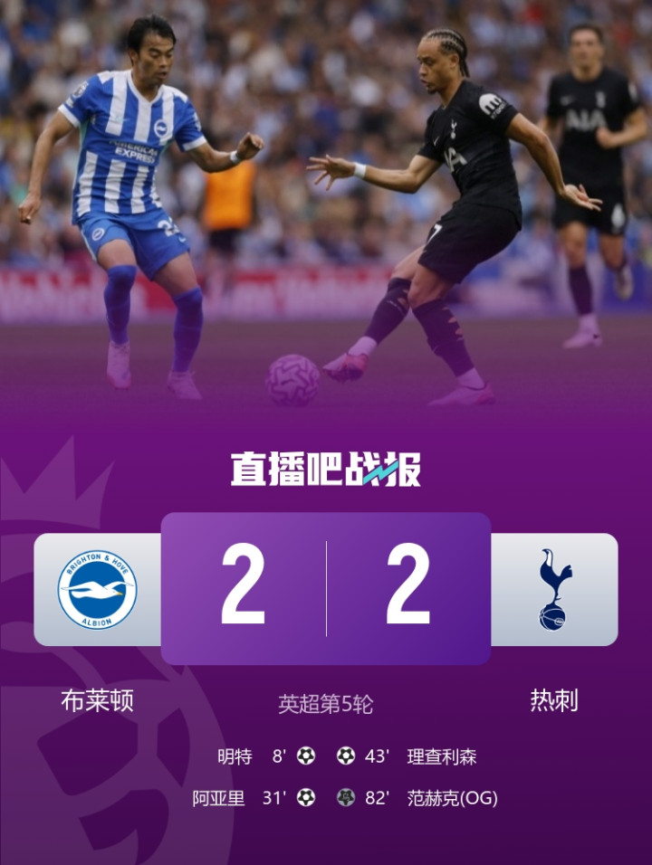 理查利森建功,布莱顿2-2热刺。本场过后,热刺3胜1平1负积10分暂升第2,布莱顿1胜2平2负积5分排名第12。