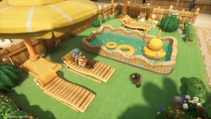 在游戏里,这种创造的乐趣被“小”视角再次放大。你可以自由地装饰自己的房间,身边一切寻常物品都焕发出新的用途,纽扣成为了板凳,耳机化身成了音箱。除了自己的小房子可以装饰,玩家还可以对室外的一些区域进行改造,比如放置栅栏、铺上地砖、种上花草,就像打理自家小院一样,又或者安置泳池、遮阳伞,晒上美美的日光浴。