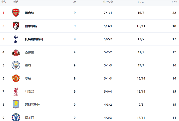 在积分榜上,阿森纳以22分高居榜首。伯恩茅斯紧随其后,拿到18个积分。身价只有4.4亿欧元的伯恩茅斯能够来到这个位置,非常不容易。热刺以17分排名第3。桑德兰也是17分,排名第4。没想到伯恩茅斯和桑德兰这两匹黑马都杀入欧冠区。曼城16分排名第5。曼联也是16分,排名第6。利物浦15分排名第7。
