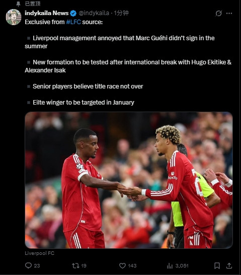 “利物浦管理层对没有在夏窗签下格伊感到恼火;国际比赛日后将与埃基蒂克&伊萨克一起测试新阵型;资深球员相信冠军争夺战还没有结束;精英级别边锋将在一月份成为目标。”
