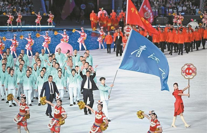 走在队伍最前方的旗手,是青海自主培养的射击新星刘延昌。这位出生于2004年的小将已经是全国青少年射击锦标赛男子10米气手枪冠军,并在本届全运会上助力青海射击队拿到男子10米气手枪团体第七名。他高举的青海省体育代表团团旗,不同于更多省份团旗的红色,而是清新、靓丽的蓝色,格外醒目。那片深邃的青蓝在绚烂的灯光中摇动,如青海湖的波光,如三江源的天幕,如昆仑山巅的色泽。